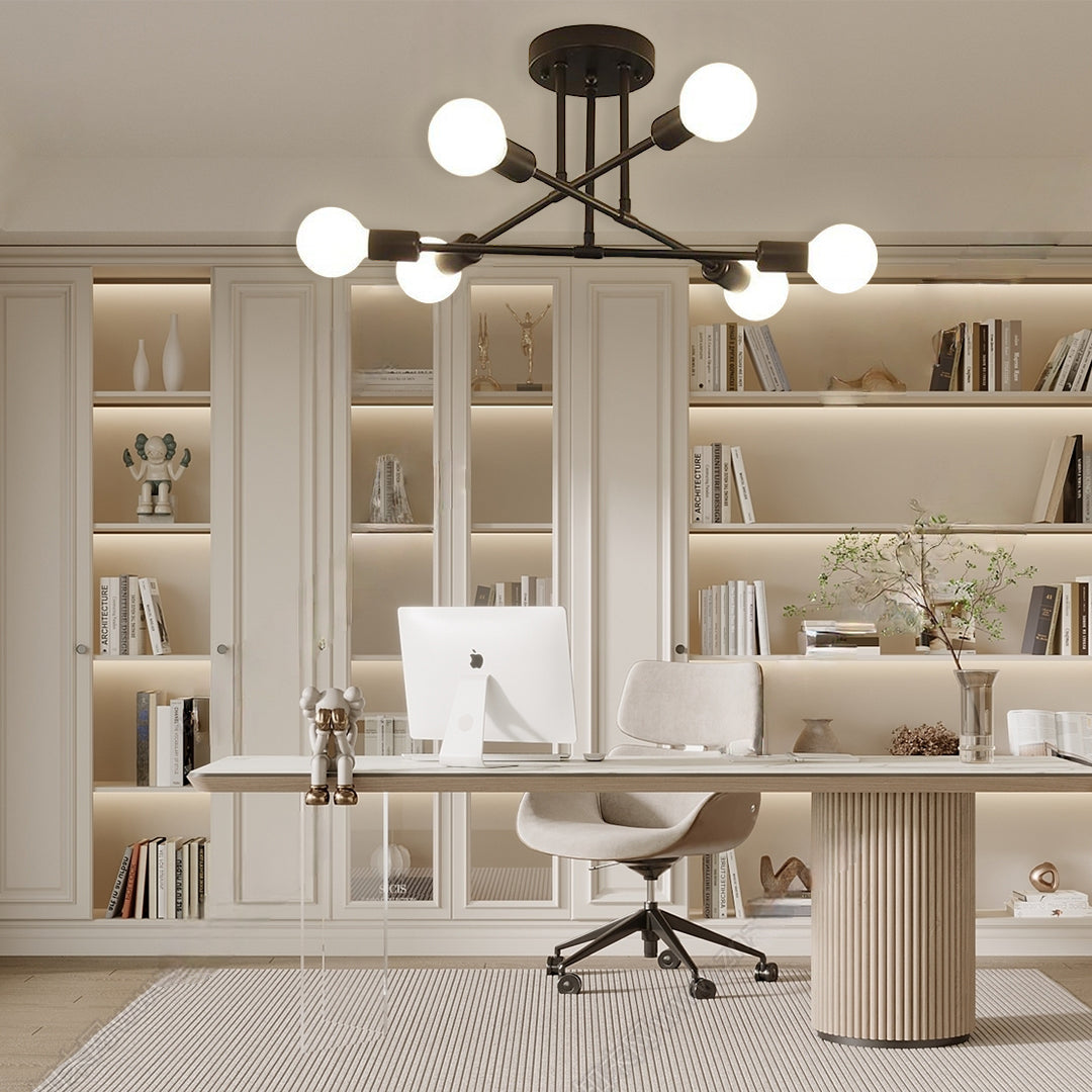 - This semi-flush mount ceiling light is made of gold/black metal crossed linear arms and 6 white bright global shades, each arm holding a single exposed LED bulb. A modern chandelier has a 9.05” hanging height in a cluster design that adds sophistication to your space.