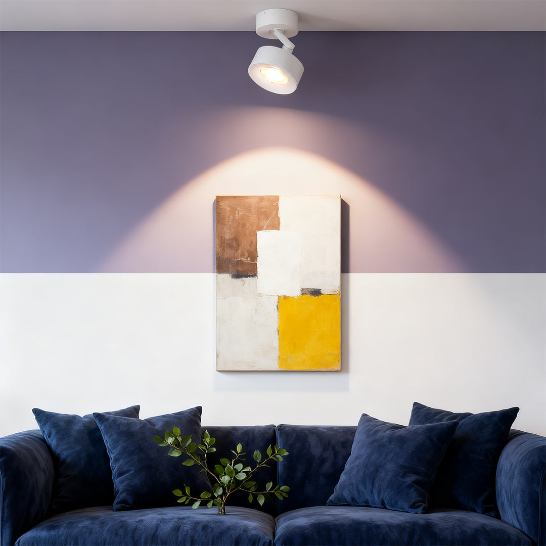 This adjustable led ceiling spotlights is made of aluminum and acrylic lampshade, offering two classic color options: white and black. It is equipped with high CRI LED light source, supporting three color temperatures: 3000K warm light, 4000K neutral light, and 6000K cool white light, with a power of 10W. It features a 350° horizontal rotation capability and a 24° precise beam angle, combined with a Ra98 ultra-high color rendering index, providing a high-quality lighting solution for ceiling installation scenarios.