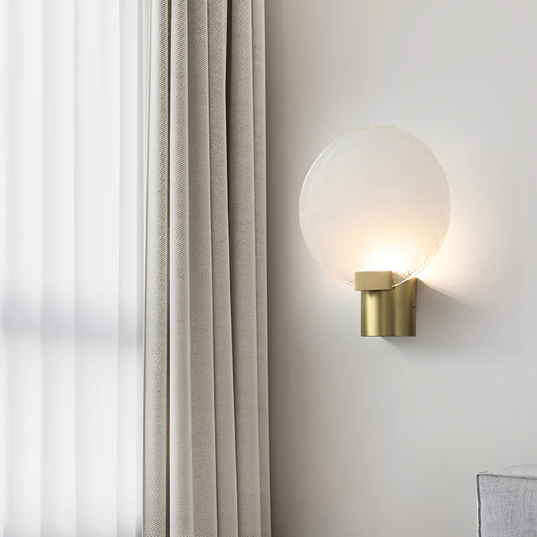 Lightweight Luxury Glass Wall Lamp: A stunning gold fixture with a textured circular glass shade. It casts a soft, ambient glow perfect for winding down before sleep.