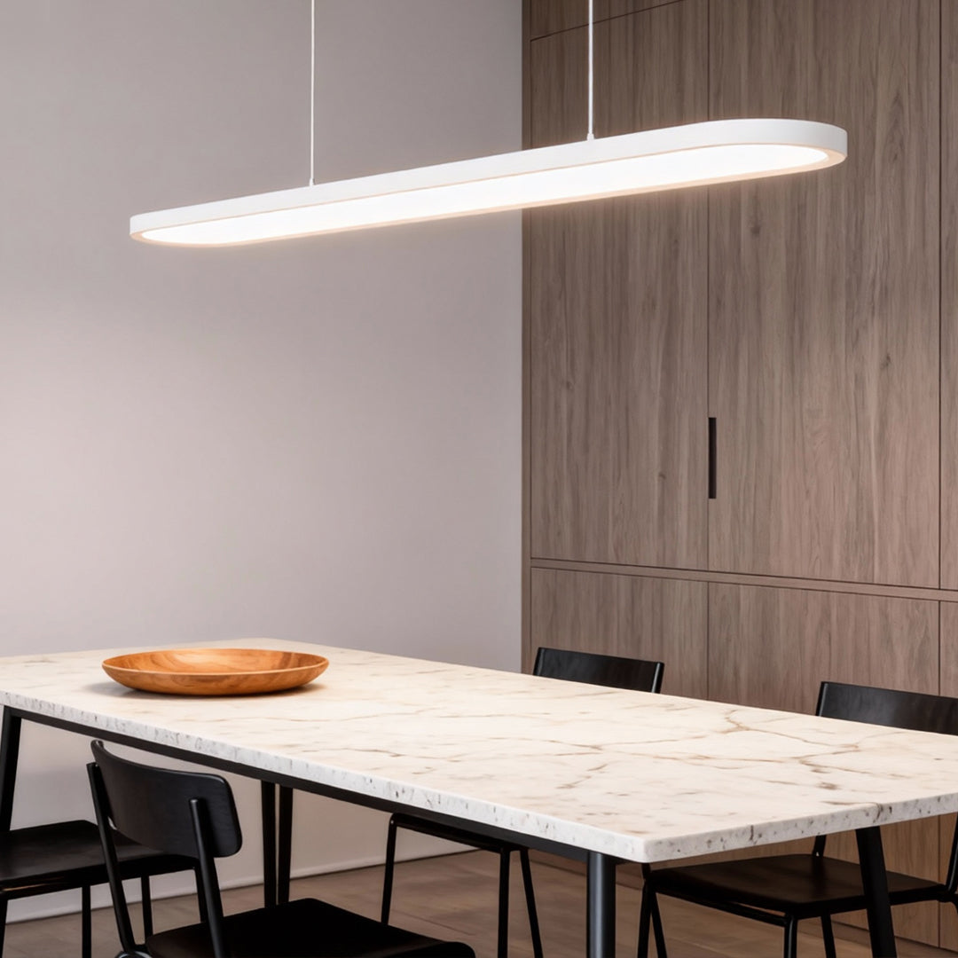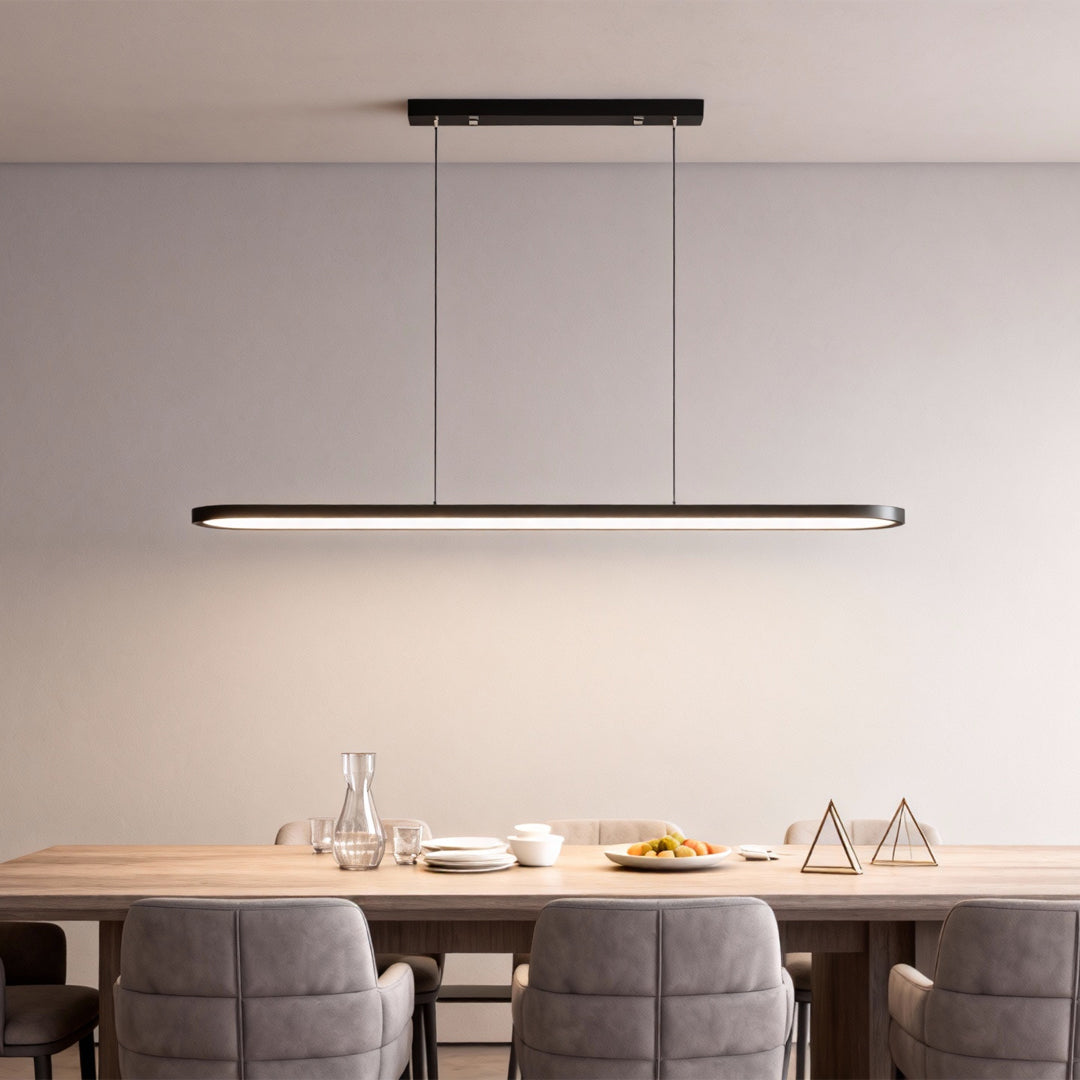- This pendant lighting features a long strip, rounded rectangle exterior design to create an artistic atmosphere in your home for a great look and feel. The lamps are made of metal and acrylic materials, which are fade-resistant, scratch-resistant and rust-resistant.