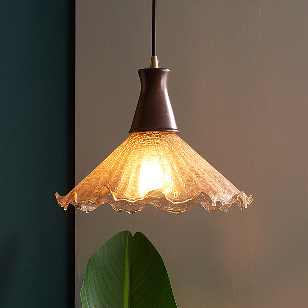 This brass pendant light fixtures features an H65 brass body paired with cracked glass shade and walnut wood accents. It uses an E27 screw base with warm light source and a 1.8-meter adjustable suspension cord, creating a nostalgic and romantic lighting solution for bedrooms, dining rooms, and homestays.