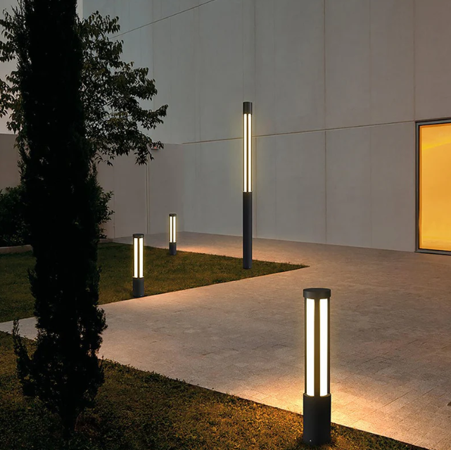 LED Black Modern Landscape Bollard Lights: A compact version of the pillar, this bollard offers the same modern aesthetic at a lower profile. Ideal for lining garden paths or framing flower beds with a soft, guiding glow.