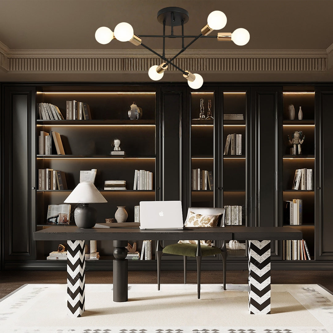This 6-Light Flush Mount Light flaunts a distinctive Sputnik design with linear iron arms in different directions on a horizontal plane and they are radiating from a central modern hub fixture, creating a striking visual impact. Available in an array of finishes—White + Gold, Black + Gold options, and classic monochrome options in White, Black, or Gold—each light is crafted to showcase a sleek, polished look. The compact dimensions (22'' Dia x 9'' H) ensure a balanced presence that complements any room.