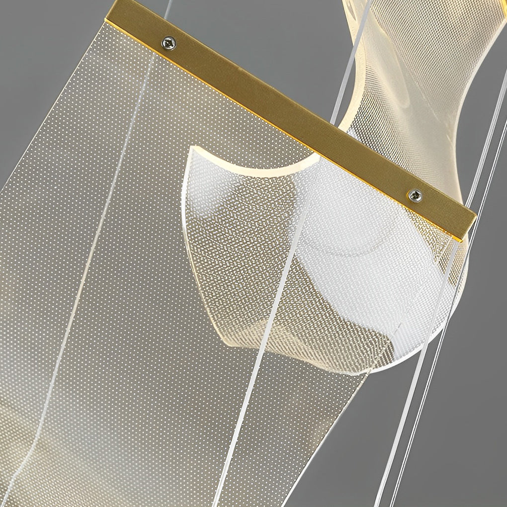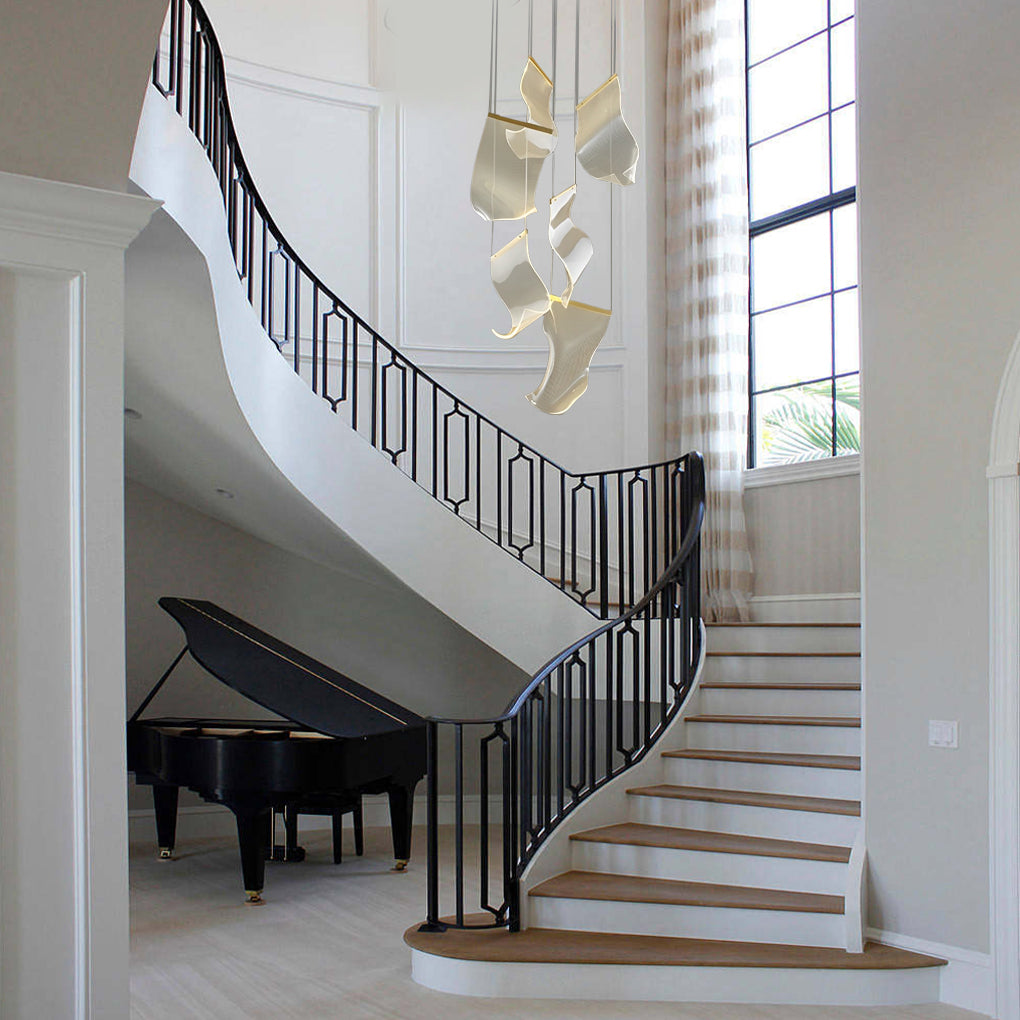 - Acrylic lampshade of duplex staircase chandelier has high light transmission and clear texture. It looks like pieces of irregularly curled paper, and with nice lighting effect.