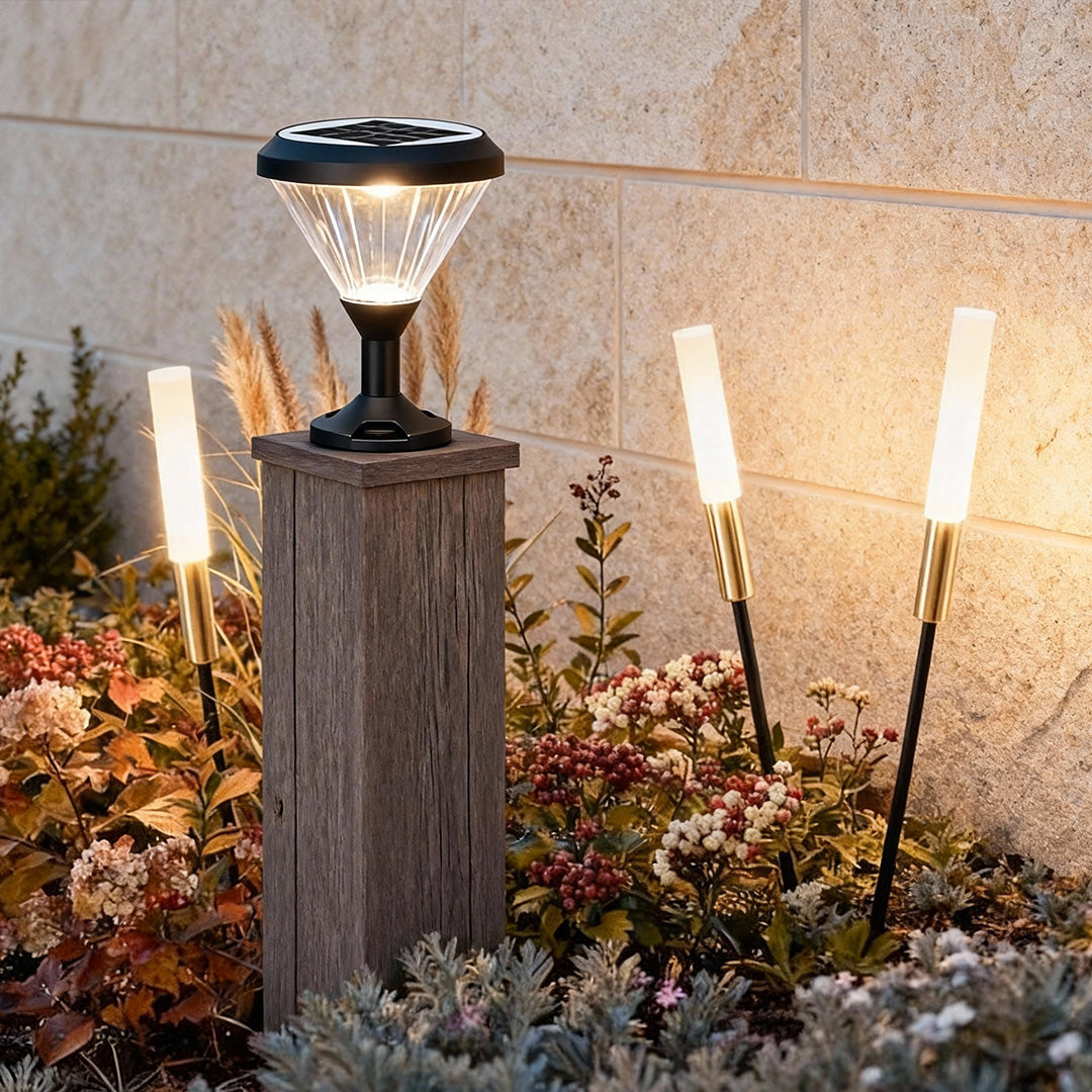 Black Modern Solar Post Caps Lights: A modern, architectural fixture featuring a black inverted cone frame with a fluted clear shade. It mounts easily to standard posts, providing bright, structured illumination for your fence lines or deck corners.