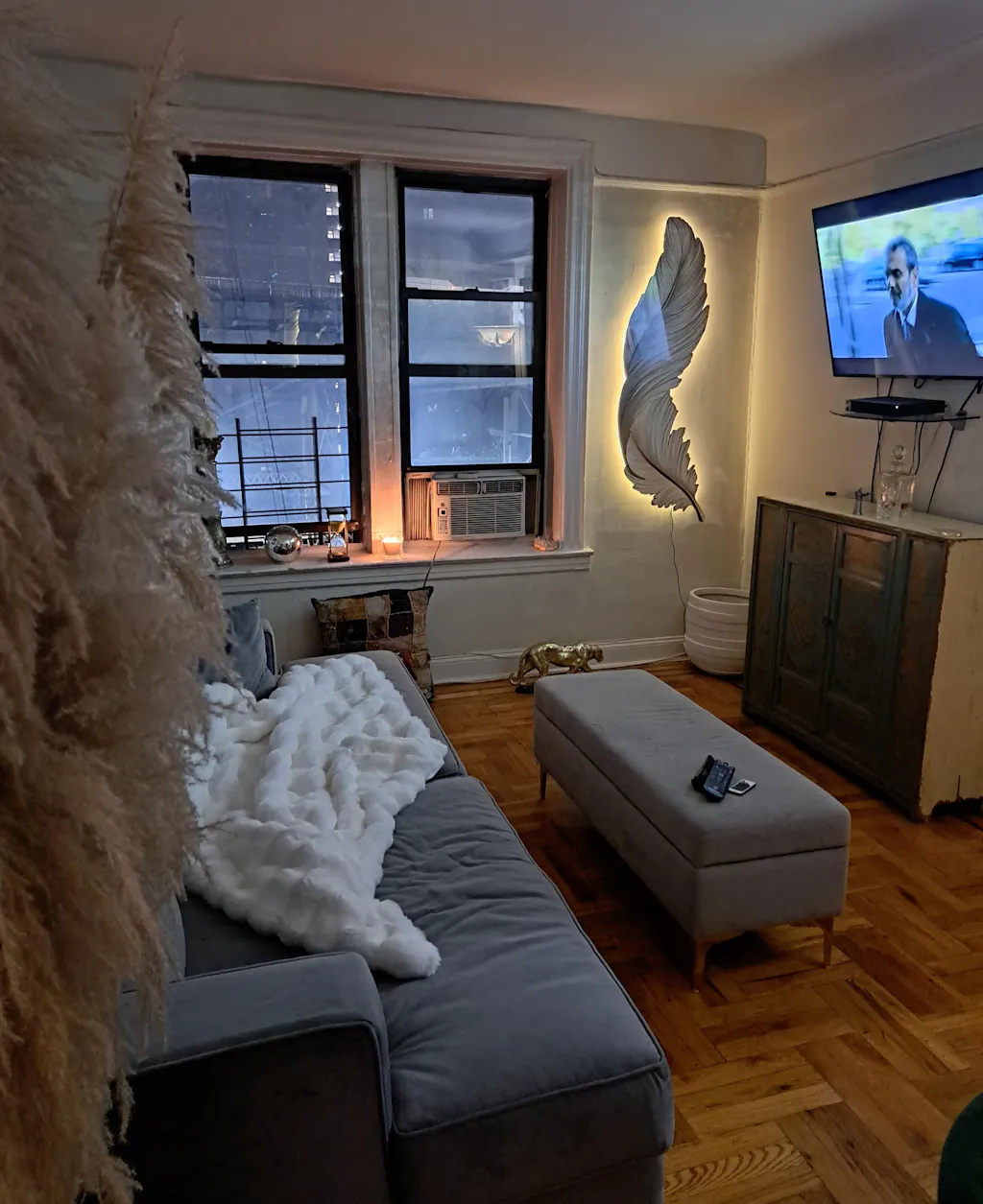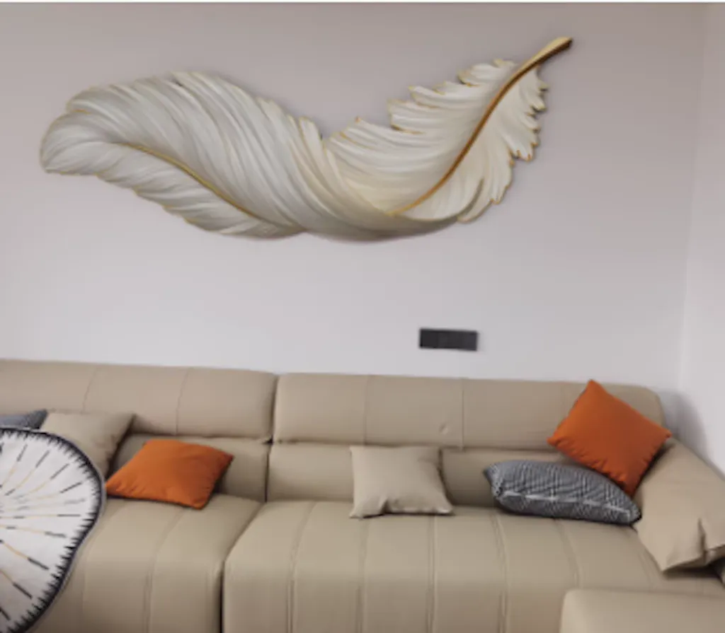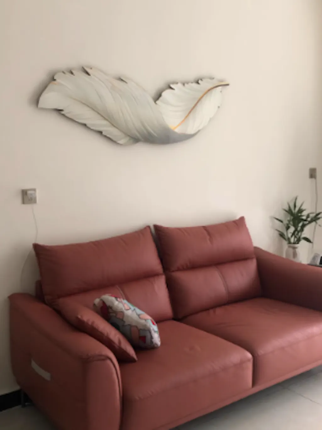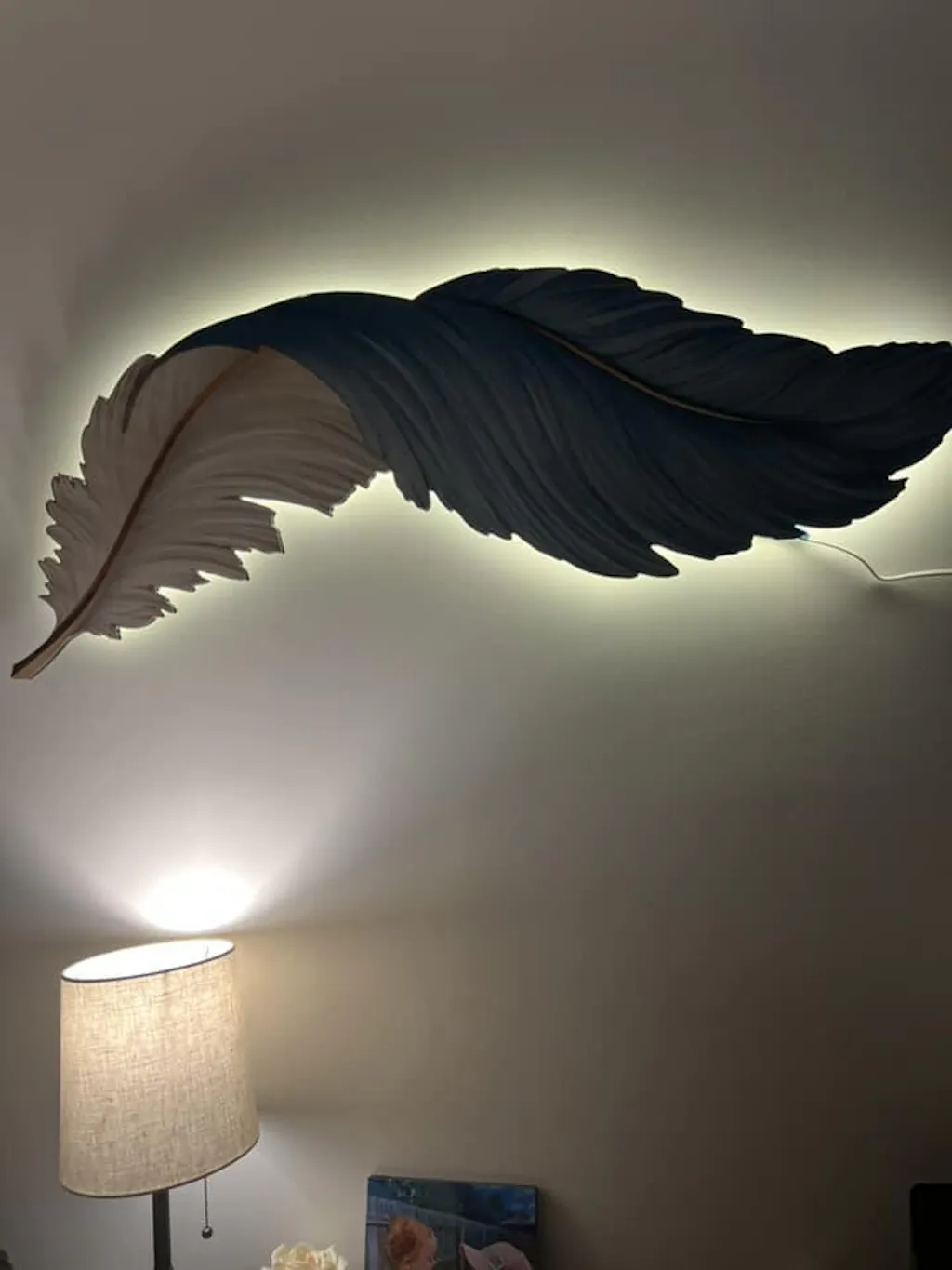 This feather wall lamp combines feather art painting with hidden LED light strips, powered by USB DC 5V. It supports remote control switching and brightness adjustment. It offers three color themes: blue, white, and orange, as well as two hanging orientations: horizontal and vertical. Four size specifications are available to fit different wall dimensions. The light is softly diffused from the LED strips behind the feathers, with the surface not emitting direct light, creating a hazy artistic glow. The adapter can be hidden behind the painting, ensuring a simple and aesthetically pleasing installation. It is suitable for spaces such as living rooms, bedrooms, and corridors, infusing modern homes with a decorative atmosphere of interwoven light and shadow.