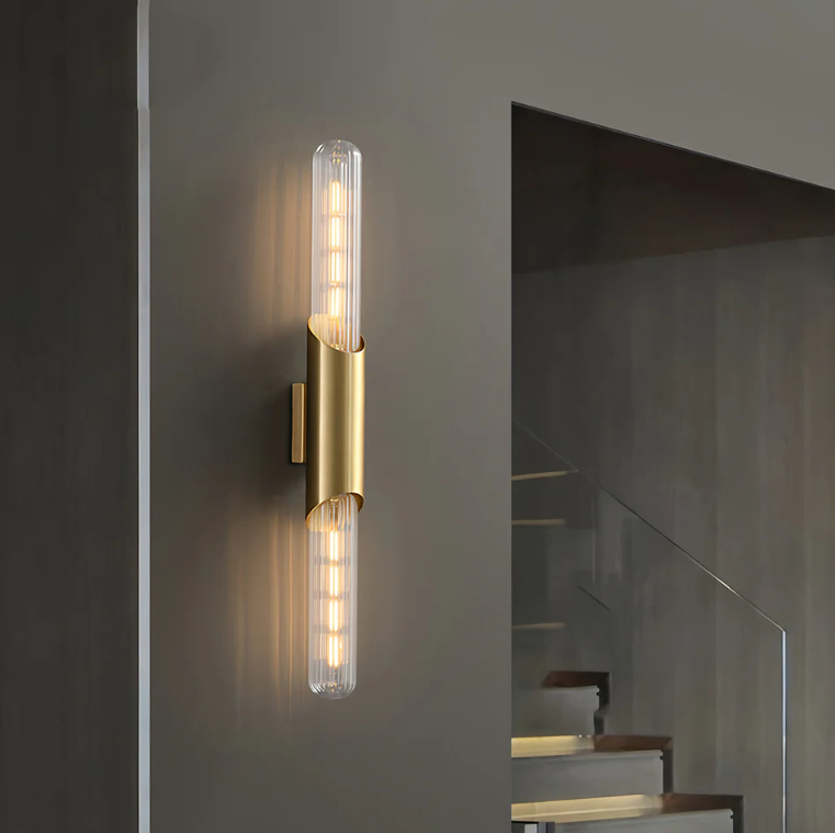 Full Brass Up Down Wall Lights : A sleek, vertical gold fixture with clear glass elements. It echoes the chandelier’s elegance while adding height and warm accent light to your walls.