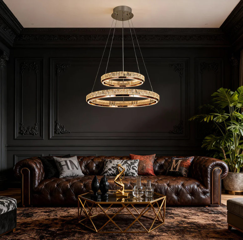 Luxury Round Ring Chandeliers:: A stunning 2-tier fixture featuring interlocking gold rings encrusted with sparkling crystals. It serves as the radiant crown jewel of your room.