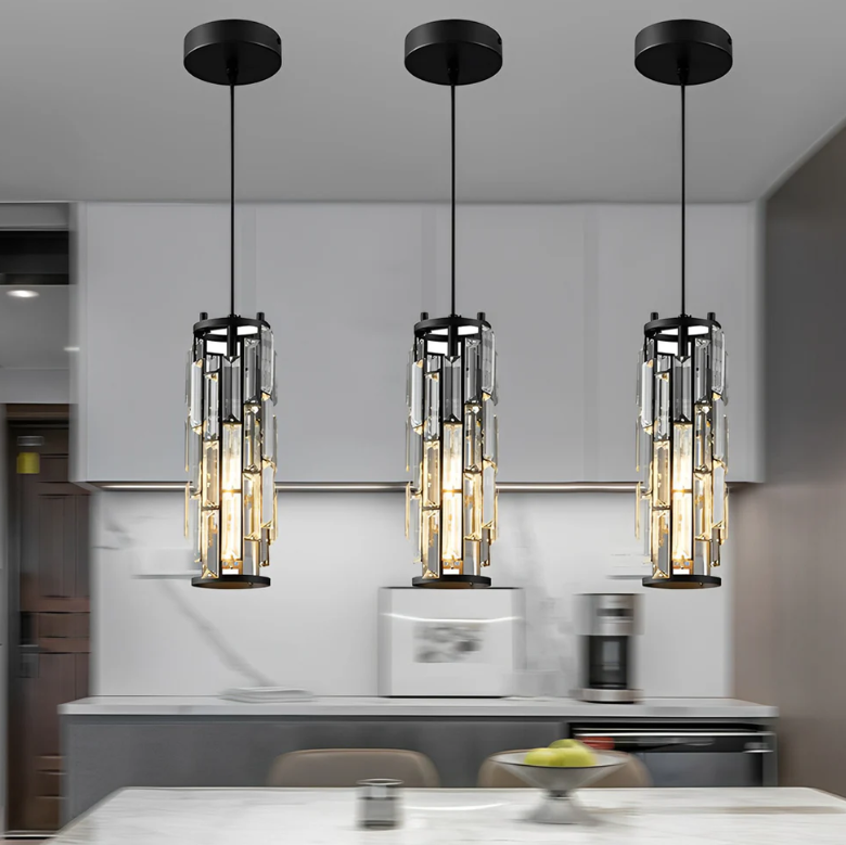 Creative Crystal Glass Pendant Lights: Elegant cylindrical fixtures adorned with vertical crystal rods and black accents. Perfect for hanging over your kitchen island or breakfast bar to add a touch of sparkle and luxury.