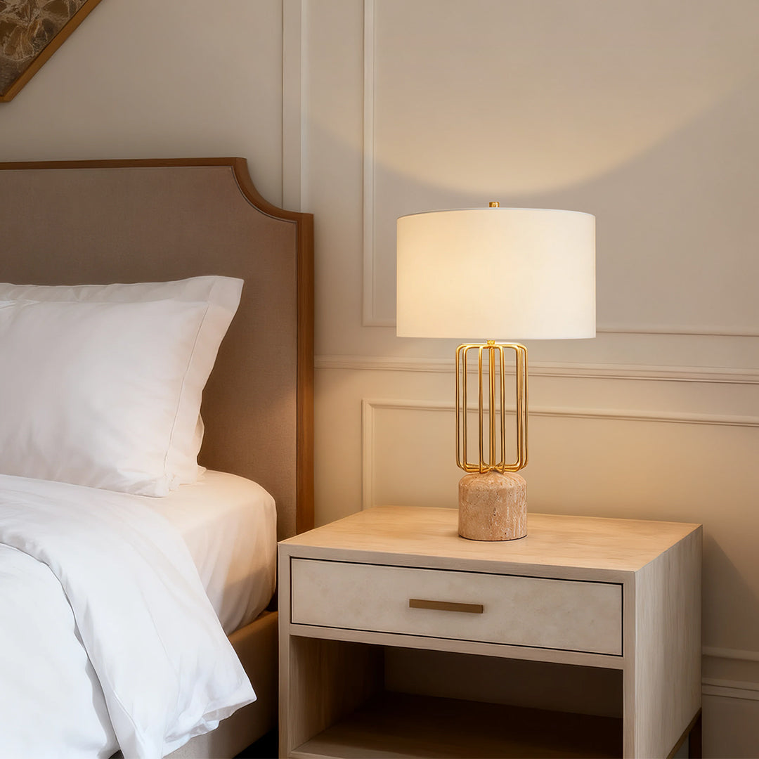 This Nordic-style geometric metal cage table light features a natural limestone base, a metal lamp body combined with a white fabric shade. It requires a self-configured E26 socket light source, with a hard-wiring design that seamlessly integrates into Nordic home decor, providing a natural and minimalist lighting solution for reading corners, bedrooms, and other spaces.
