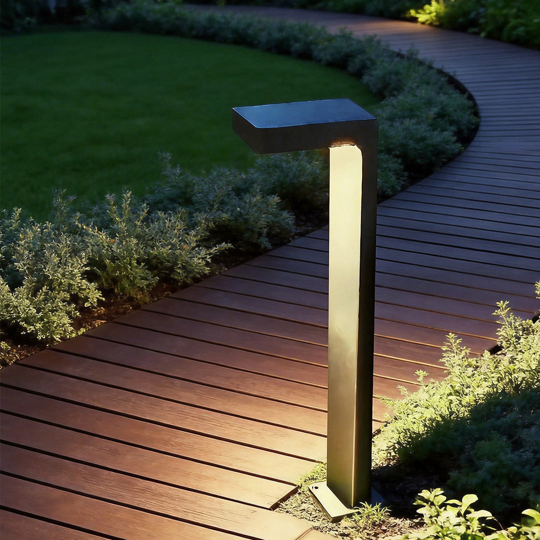 This L shaped landscape light features a die-cast aluminum body and glass lampshade. It is available in three height specifications and offers two power supply modes: solar or hardwired. The 3000K warm light provides a cozy and bright illumination, while the IP65 full waterproof rating ensures stable operation throughout the year. It is suitable for installation in garden paths, park trails, courtyard lawns, and other locations, delivering intelligent and reliable functional lighting.